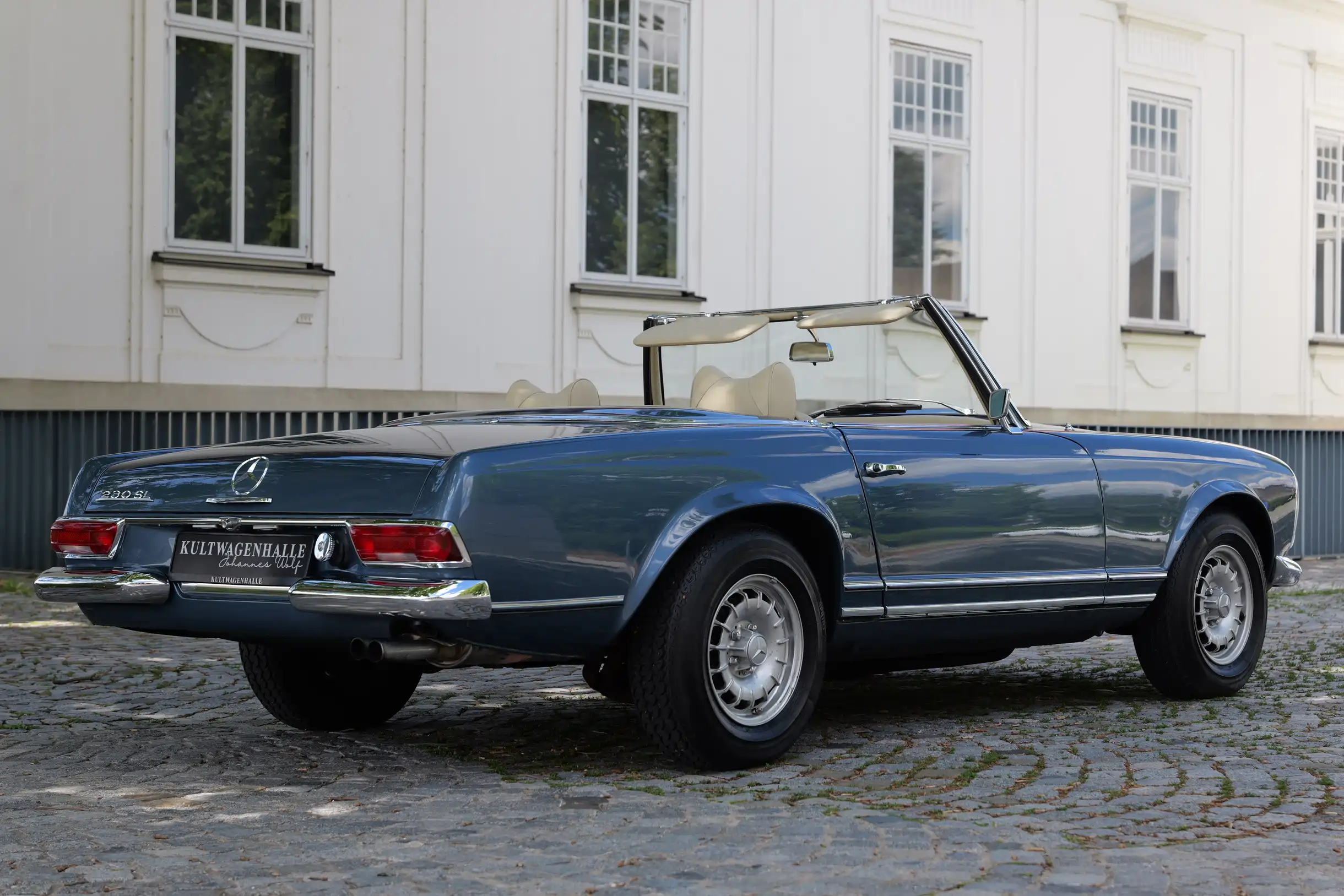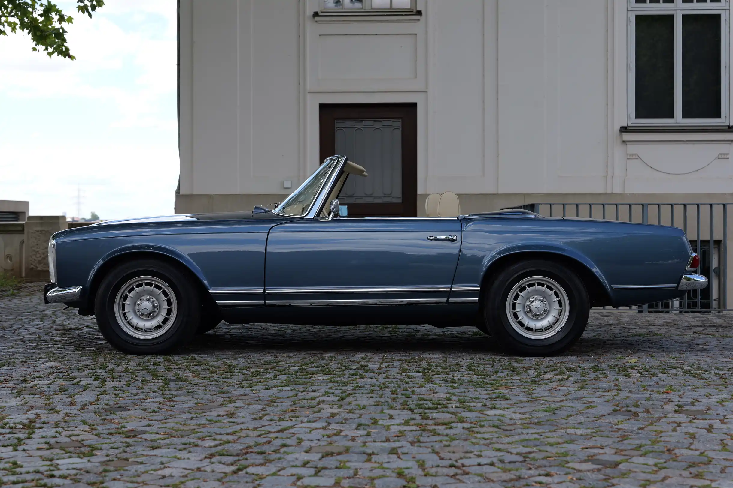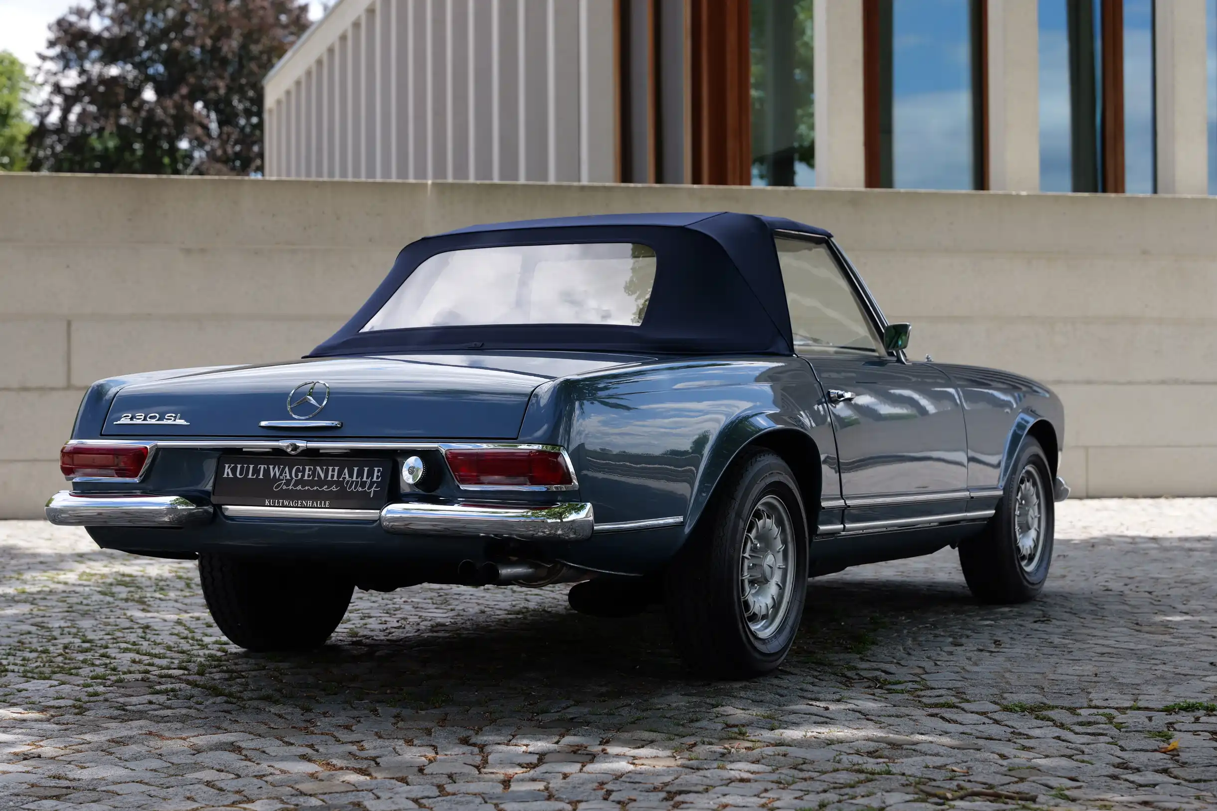 Der hier angebotene Mercedes-Benz 230SL Pagode mit Erstzulassung im September 1966 fasziniert mit einer sehr schönen Lackierung in der Farbe Mittelblau-Metallic (396) in Verbindung mit einer neuwertigen Lederausstattung in der Farbe Pergament. Das neuwertige Stoffverdeck in der Farbe Marineblau schließt passgenau und faltenfrei. Die Armaturentafel, alle Bedien- und Anzeigeinstrumente sind intakt, in einem schönen Zustand und werden durch ein klassisches Becker Mexico Cassette Radio vervollständigt. Der M127.II Sechszylinder-Reihenmotor mit mechanischer Saugrohreinspritzung entwickelt 150 PS Leistung und 196 Nm Drehmoment. Das Viergang-Automatikgetriebe arbeitet ebenfalls tadellos. Eine TÜV Rheinland Classic Cars Basisbewertung aus dem Jahr 2015 bescheinigt dem Roadster die Zustandsnote 2. Aufgrund der fehlenden Historie für das Fahrzeug, eignet sich diese Pagode nicht unbedingt als Sammler- und Investitionsobjekt. Aber der charaktervolle Roadster bietet eine Menge Fahrspaß und ist mit seiner seltenen Farbkombination und dem gepflegtem Erscheinungsbild ein echter Hingucker. Der neue Besitzer darf sich auf eine technisch einwandfreie und äußerst elegante Pagode freuen, welche auf der Straße sicher alle Blicke auf sich ziehen wird.