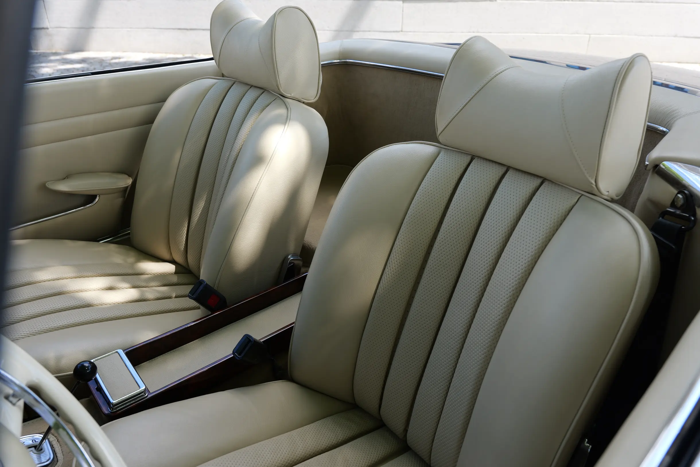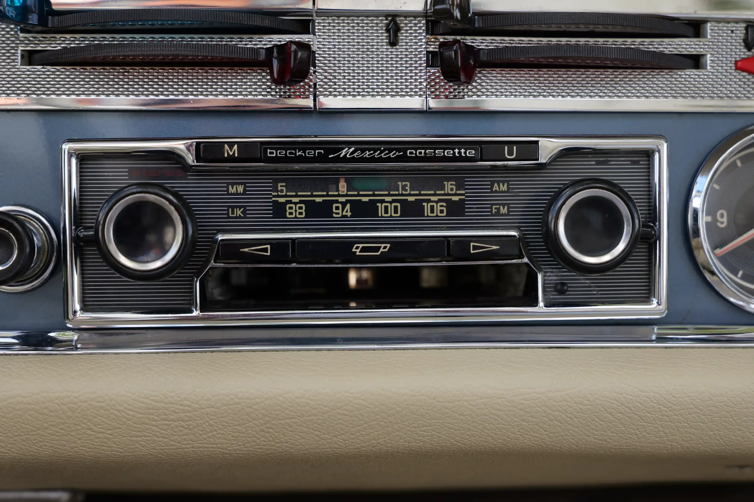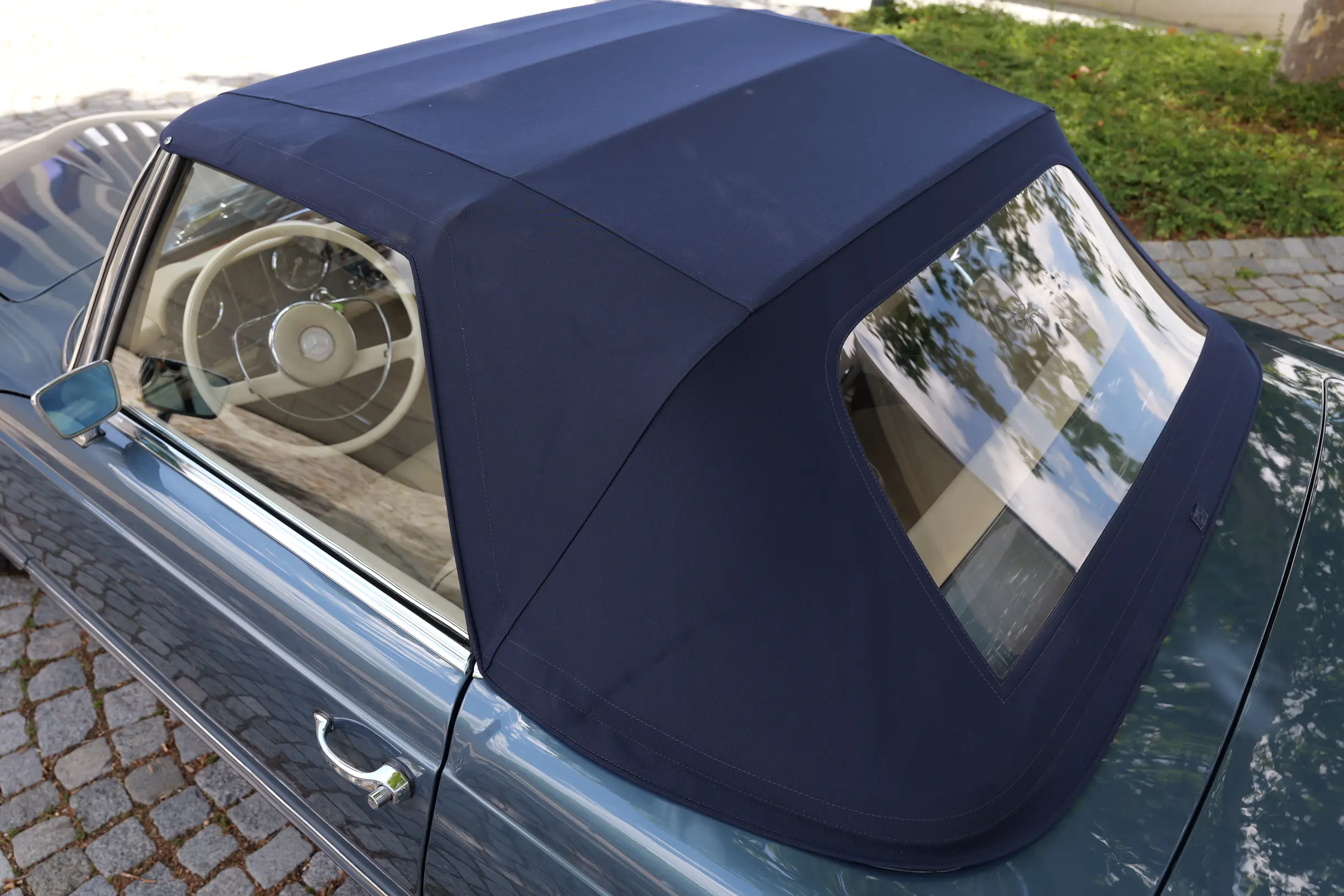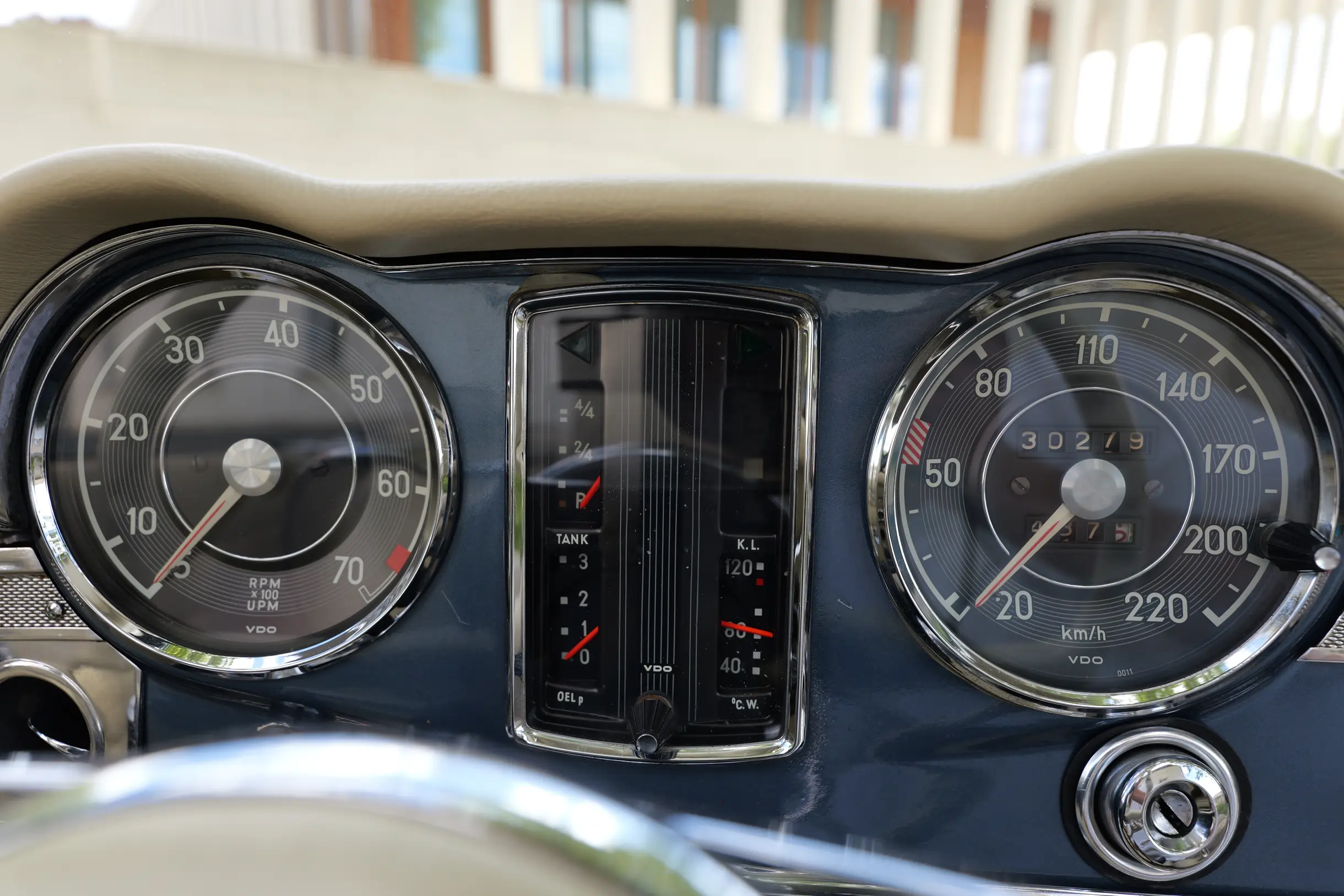 Der hier angebotene Mercedes-Benz 230SL Pagode mit Erstzulassung im September 1966 fasziniert mit einer sehr schönen Lackierung in der Farbe Mittelblau-Metallic (396) in Verbindung mit einer neuwertigen Lederausstattung in der Farbe Pergament. Das neuwertige Stoffverdeck in der Farbe Marineblau schließt passgenau und faltenfrei. Die Armaturentafel, alle Bedien- und Anzeigeinstrumente sind intakt, in einem schönen Zustand und werden durch ein klassisches Becker Mexico Cassette Radio vervollständigt. Der M127.II Sechszylinder-Reihenmotor mit mechanischer Saugrohreinspritzung entwickelt 150 PS Leistung und 196 Nm Drehmoment. Das Viergang-Automatikgetriebe arbeitet ebenfalls tadellos. Eine TÜV Rheinland Classic Cars Basisbewertung aus dem Jahr 2015 bescheinigt dem Roadster die Zustandsnote 2. Aufgrund der fehlenden Historie für das Fahrzeug, eignet sich diese Pagode nicht unbedingt als Sammler- und Investitionsobjekt. Aber der charaktervolle Roadster bietet eine Menge Fahrspaß und ist mit seiner seltenen Farbkombination und dem gepflegtem Erscheinungsbild ein echter Hingucker. Der neue Besitzer darf sich auf eine technisch einwandfreie und äußerst elegante Pagode freuen, welche auf der Straße sicher alle Blicke auf sich ziehen wird.