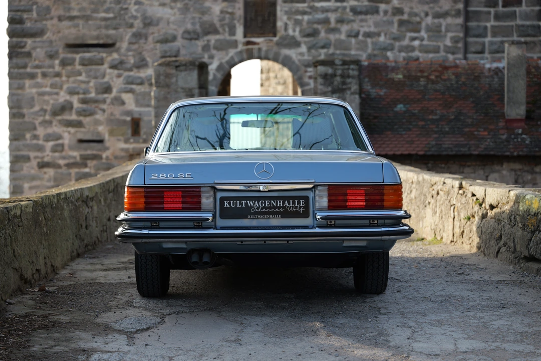 Der von uns angebotene 280SE mit seinem 185 PS starken M110 Reihen-Sechszylinder lädt zum bequemen Cruisen ein. Die Limousine in der schönen Farbkombination Graublau-Metallic und Stoff Karo Blau wurde 1978 in der Schweiz erstmals an seinen Besitzer ausgeliefert. Seit 1993 befindet sich der Wagen in Deutschland. Der erste Besitzer zog damals um nach Stuttgart. Seit 2011 befindet sich die S-Klasse in zweitem Besitz und hat heute gerade mal knapp 90.000 Kilometer auf dem Tacho. Der mit Trockeneis gestrahlte Unterboden gibt dem Blick auf die gute Substanz dieses W116 frei. Ausgeliefert mit frischem TÜV, steht dem neuen Besitzer einer Zeitreise in die 70er Jahre also nichts mehr im Wege.