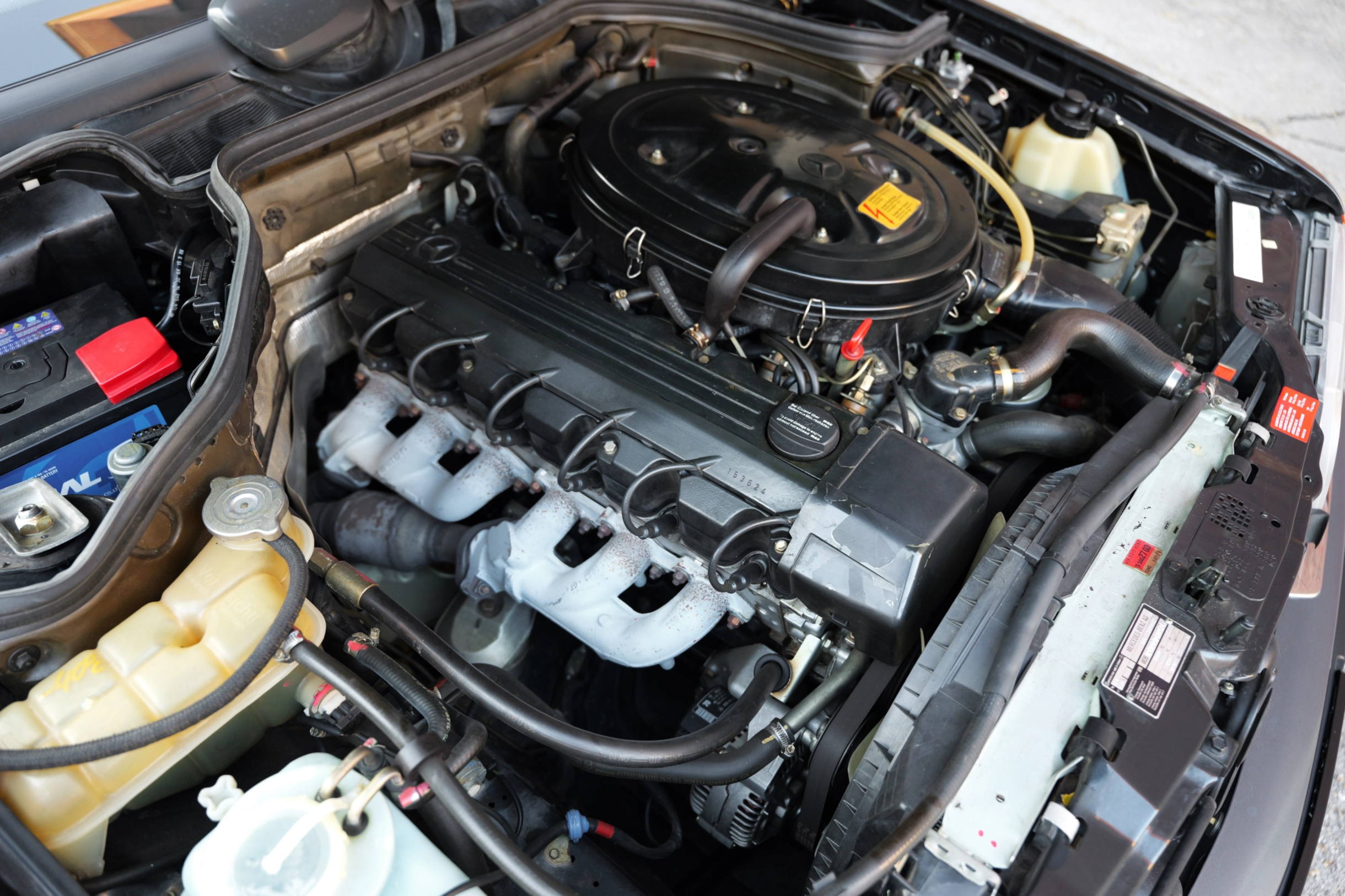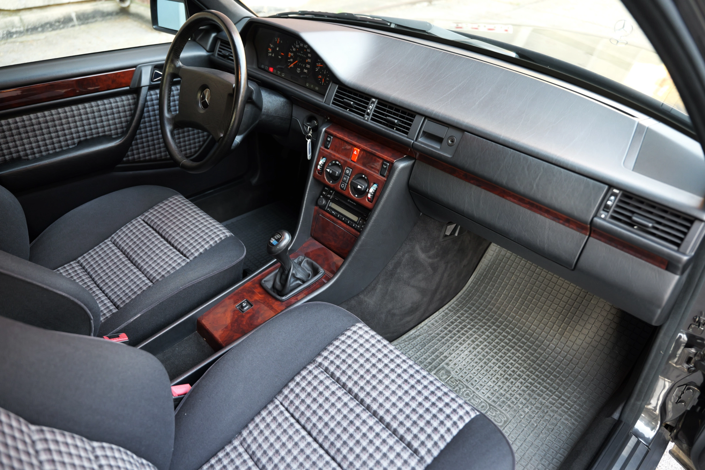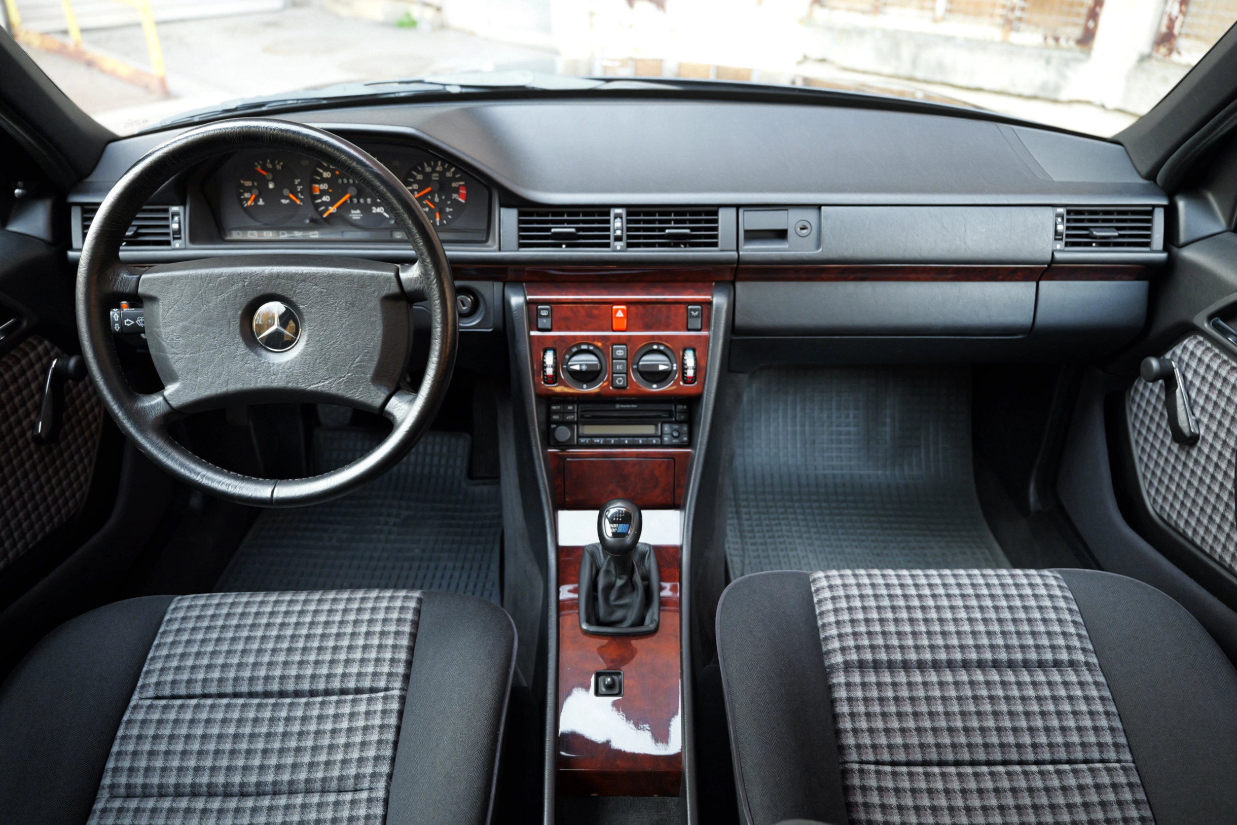 Die Lackierung in der zeitlosen Farbe Blauschwarz-Metallic (199) ist in einem hervorragenden Zustand und die Karosserie hat auch an den typischen Stellen keinerlei Rost-Ansätze. Der Innenraum mit den Sportsitzen in Stoff Karo Schwarz (071), Sport-Lederlenkrad, Sportline Lederschalthebel und Holzdekor in edlem Wurzelnuss sind durchgängig in einem sehr gepflegten Erhaltungszustand ohne wesentliche Abnutzungspuren. Zudem wurde ein zeitgenössisches und originales Mercedes-Benz CD-Radio verbaut und mit der Klimaanlage ist man auch für heiße Sommertage gut gerüstet. Der seidenweiche und kräftige M103 E30 Sechszylinder-Reihenmotor mit 2962 cm³ Hubraum, 180 PS Leistung und 255 Nm Drehmoment sorgt zusammen mit dem manuellen 5-Gang Getriebe für sportliche und souveräne Fahrfreude.