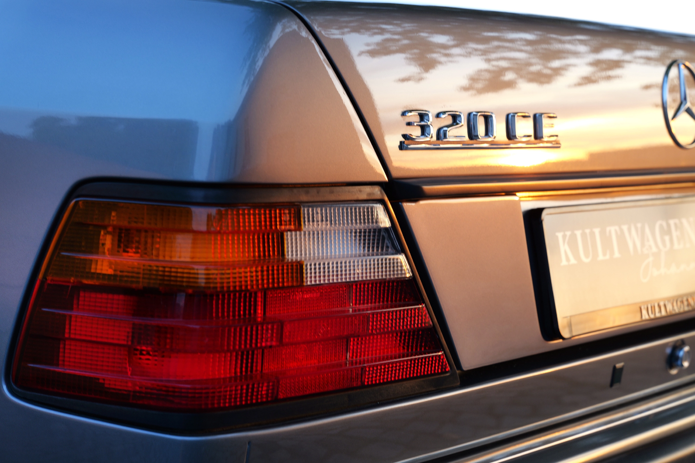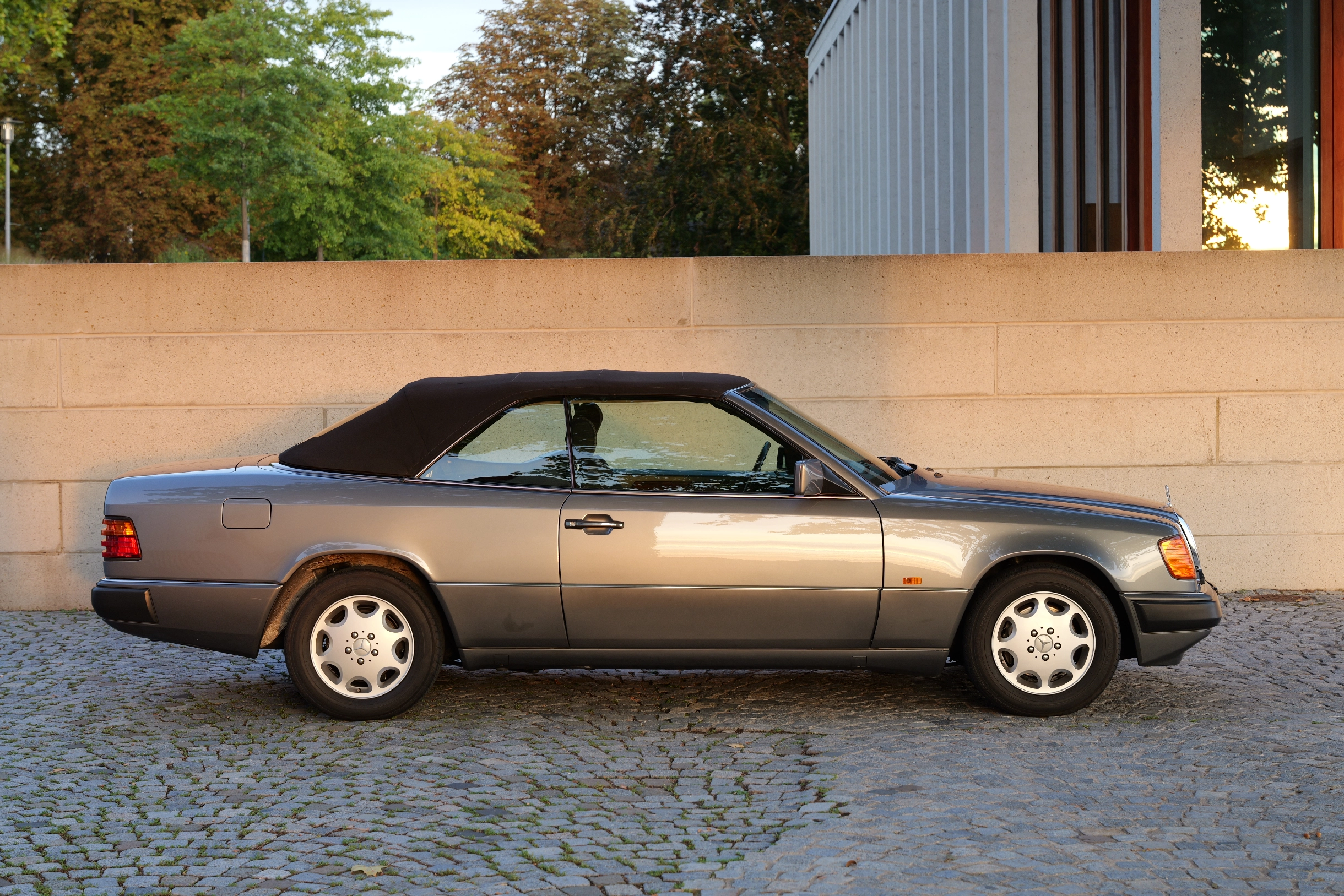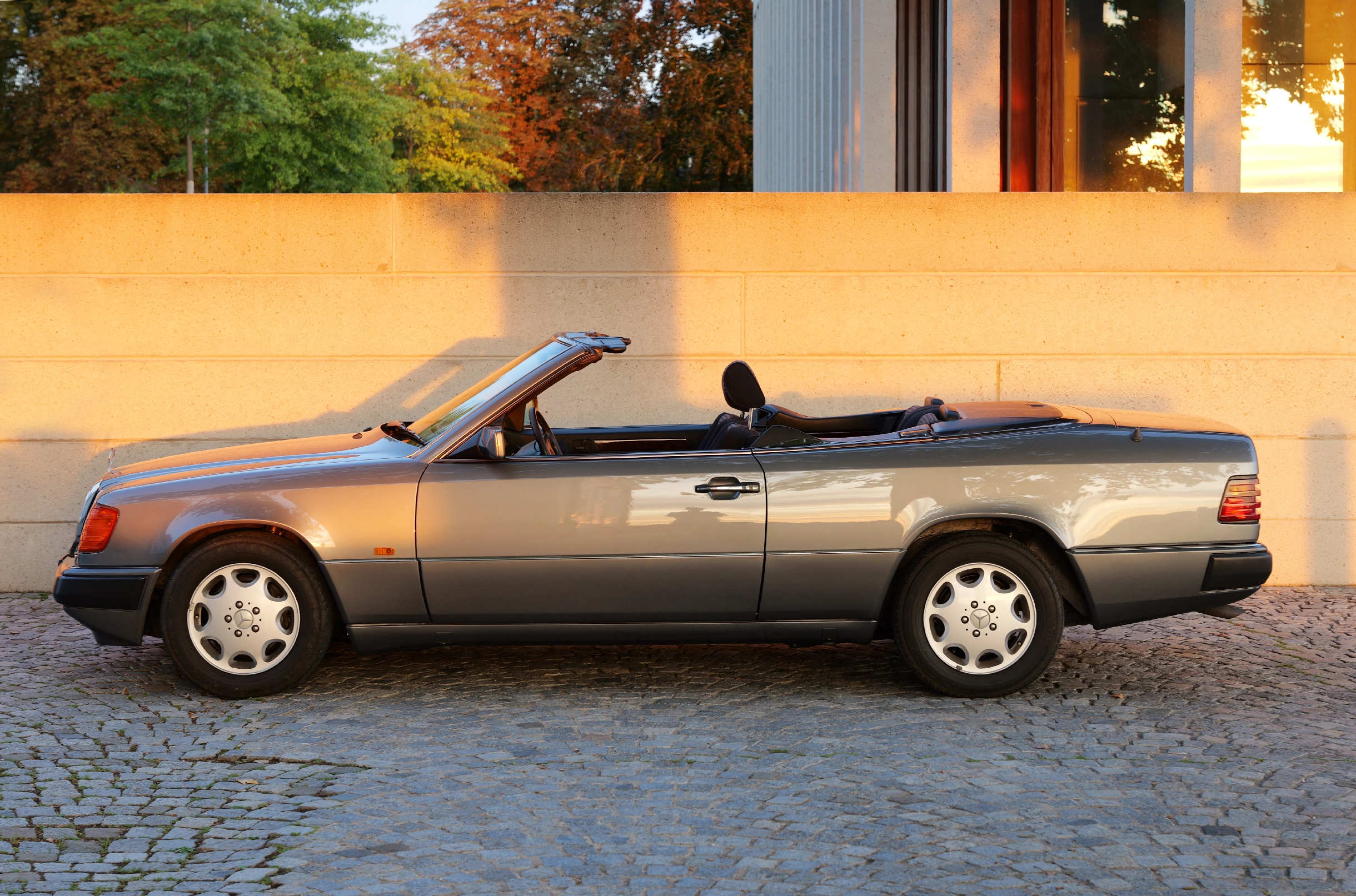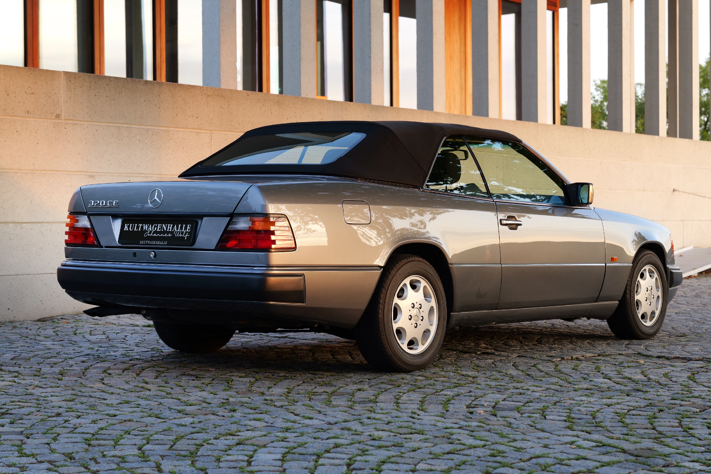 Das hier angebotene Mercedes-Benz 320CE Cabriolet mit einer aktuellen Laufleistung von knapp 83.000 km wurde als Export-Modell für den Japanischen Markt produziert. Während das Cabriolet ab Ende 1991 in Deutschland und in anderen europäischen Staaten zunächst ausschließlich mit dem bereits auslaufenden 3-Liter-Vierventilmotor M104 als 300CE-24 angeboten wurde, kam bei den Exportmodelle für Nordamerika und Japan ab 1992 bereits das neue 3,2-Liter-Triebwerk als 320CE auf den Markt. Der verbesserte M104 E32 Reihen-Sechszylindermotor mit 3199 ccm Hubraum, 220 PS Leistung und 310 Nm Drehmoment zeichnet sich durch eine harmonischere Kraftentfaltung, bereits bei niedrigen Drehzahlen aus. In Verbindung mit dem großen Chromgrill der ersten Modellpflege, gelben Blinkleuchten und einer Lackqualität, die bis dahin noch nicht auf die Wasserbasislacke umgestellt war, sind diese Fahrzeuge selten und beliebt. Die sportlich-elegante Farbkombination aus einer Lackierung in Perlmuttgrau-Metallic (122), Stoff-Sitzen in Karo Schwarz (371) und Zierteilen in der Variante Wurzelholz ist ebenfalls recht selten zu finden.