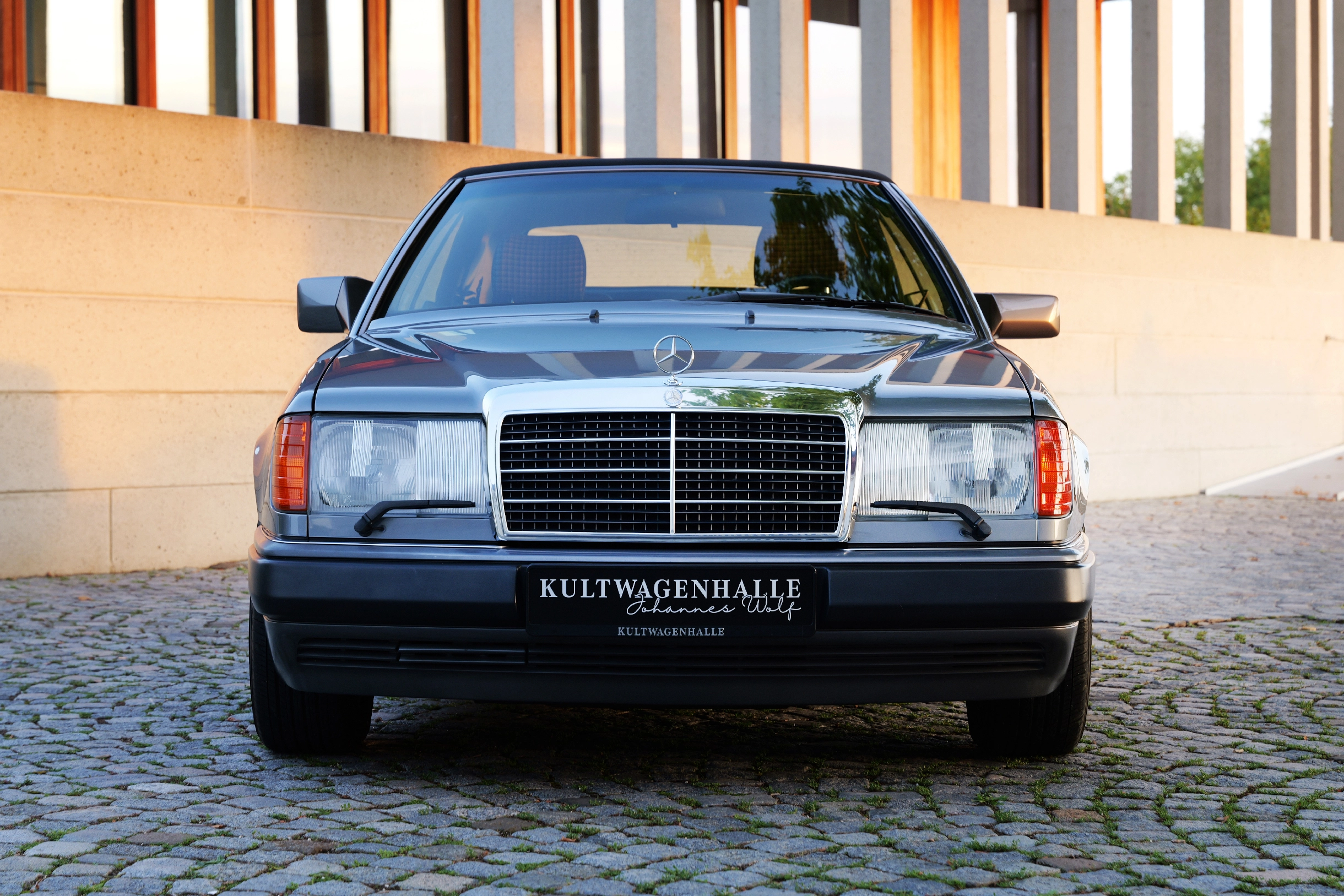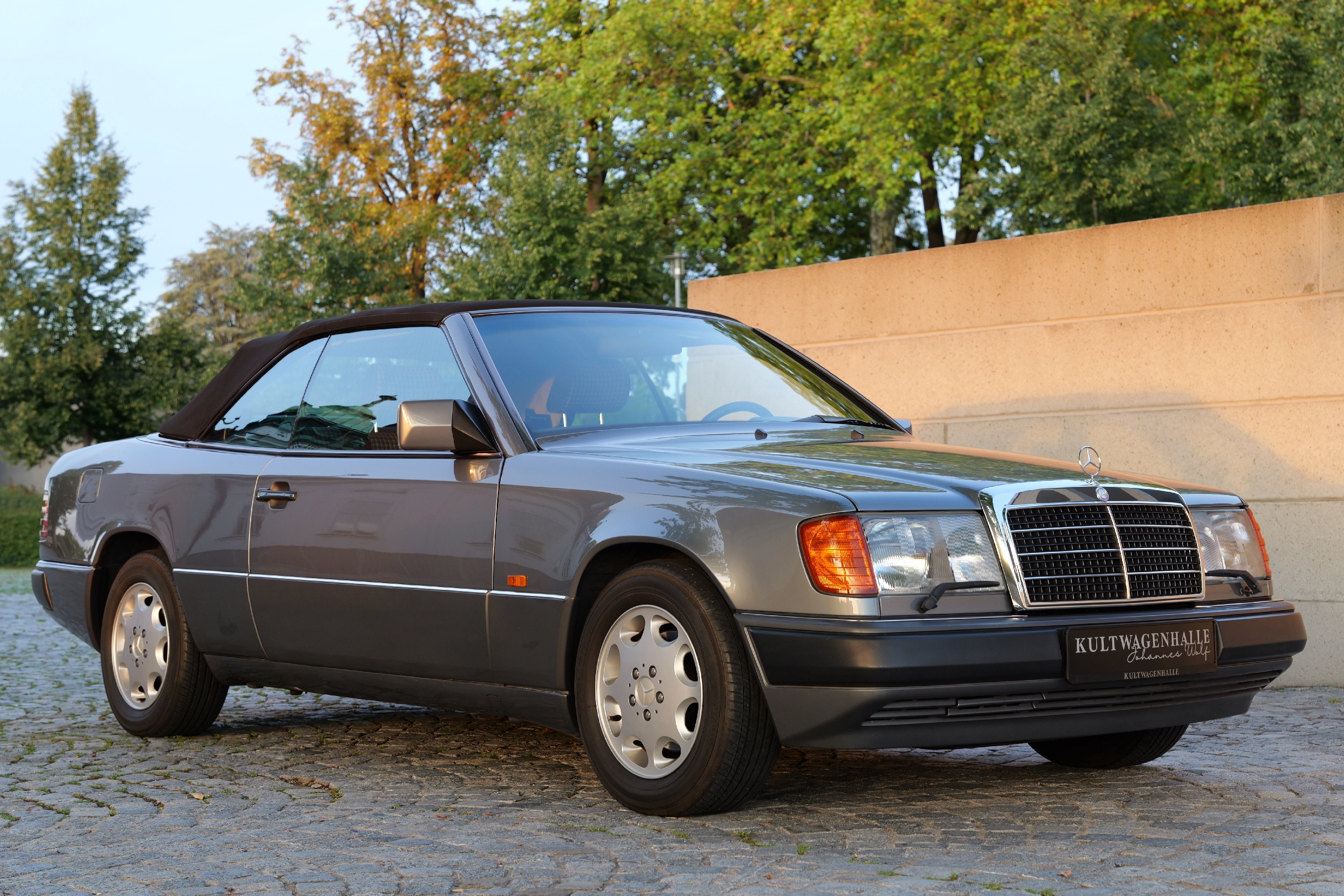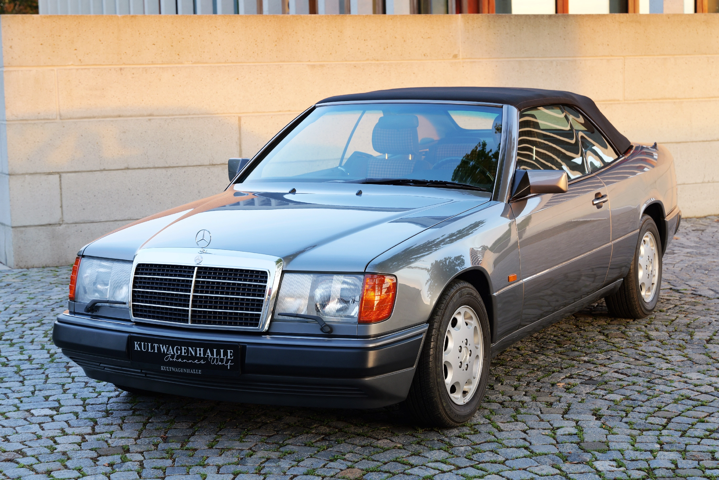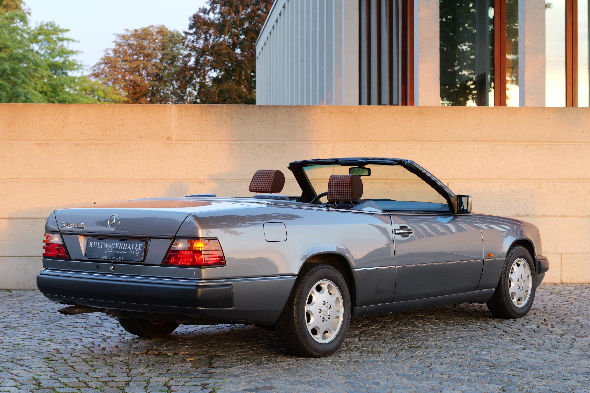 Das hier angebotene Mercedes-Benz 320CE Cabriolet mit einer aktuellen Laufleistung von knapp 83.000 km wurde als Export-Modell für den Japanischen Markt produziert. Während das Cabriolet ab Ende 1991 in Deutschland und in anderen europäischen Staaten zunächst ausschließlich mit dem bereits auslaufenden 3-Liter-Vierventilmotor M104 als 300CE-24 angeboten wurde, kam bei den Exportmodelle für Nordamerika und Japan ab 1992 bereits das neue 3,2-Liter-Triebwerk als 320CE auf den Markt. Der verbesserte M104 E32 Reihen-Sechszylindermotor mit 3199 ccm Hubraum, 220 PS Leistung und 310 Nm Drehmoment zeichnet sich durch eine harmonischere Kraftentfaltung, bereits bei niedrigen Drehzahlen aus. In Verbindung mit dem großen Chromgrill der ersten Modellpflege, gelben Blinkleuchten und einer Lackqualität, die bis dahin noch nicht auf die Wasserbasislacke umgestellt war, sind diese Fahrzeuge selten und beliebt. Die sportlich-elegante Farbkombination aus einer Lackierung in Perlmuttgrau-Metallic (122), Stoff-Sitzen in Karo Schwarz (371) und Zierteilen in der Variante Wurzelholz ist ebenfalls recht selten zu finden.