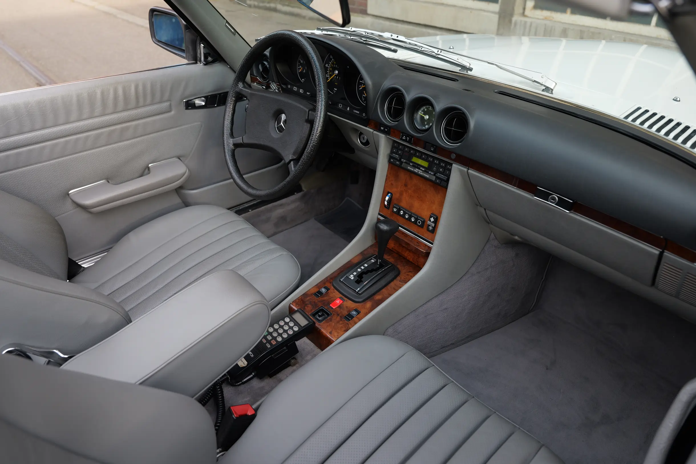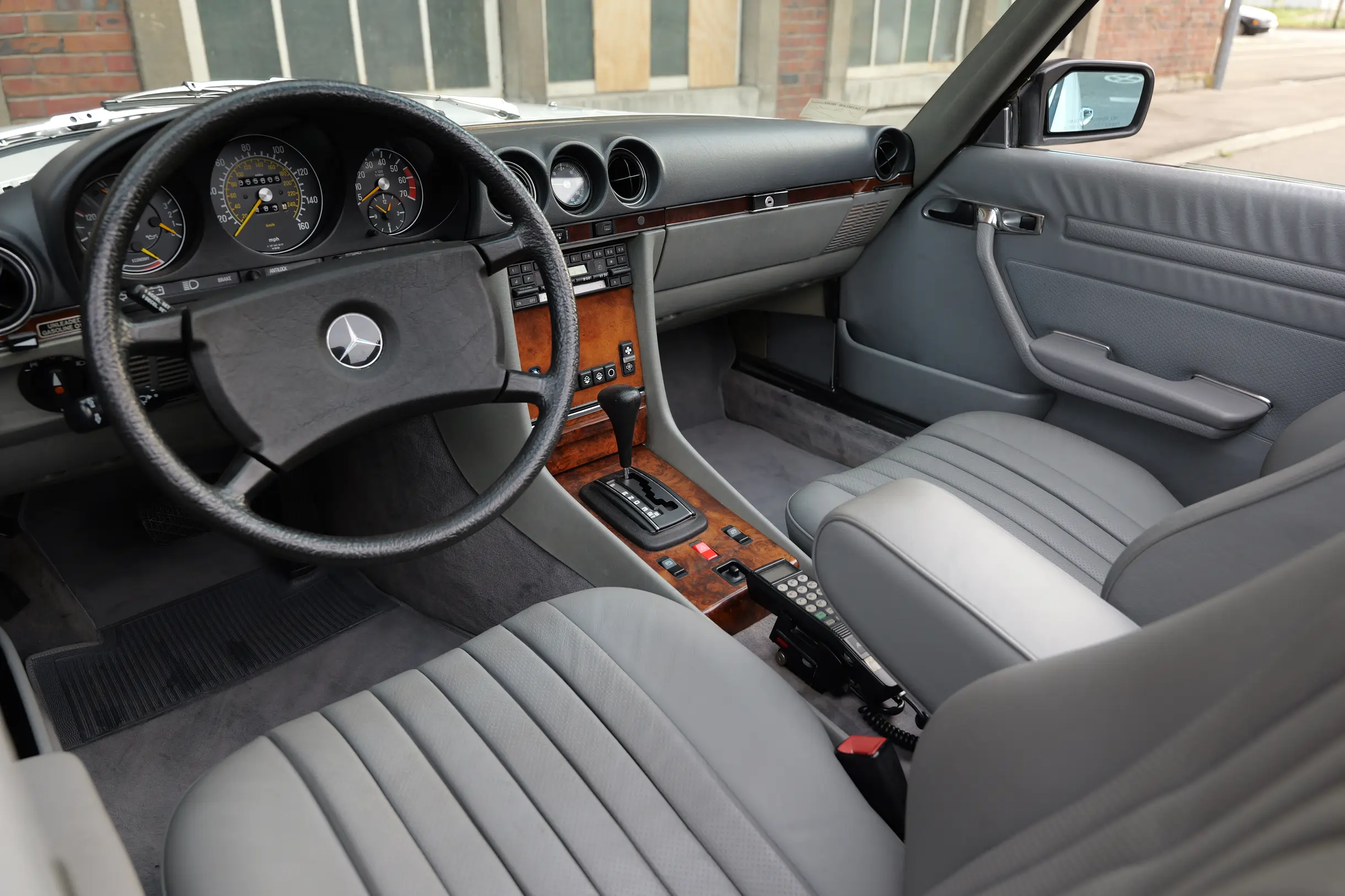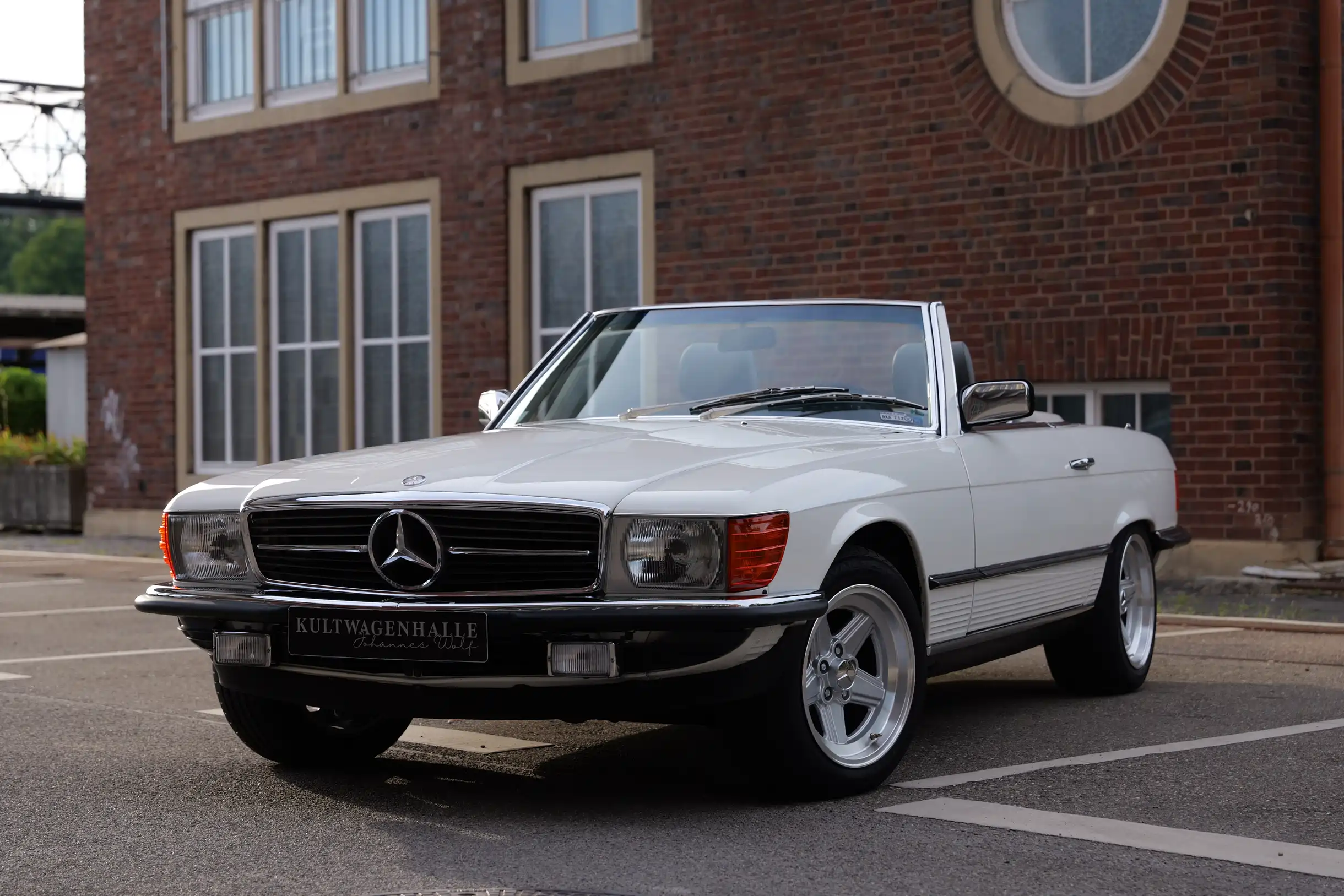 Der hier angebotene Mercedes-Benz 380SL befindet sich weitestgehend im Erstlack und versprüht mit seiner Lackierung in Classicweiß Uni (737U) und den seltenen AMG Penta 16 Zoll Alufelgen einen sportlichen Charme. Die harmonisch passende Innenausstattung in Leder Grau (278A) und das elegante Wurzelholz befinden sich in einem sehr schönen Zustand. Das Verdeck in Stoff Schwarz sowie das dazugehörige Hardtop sind ebenfalls überdurchschnittlich gut erhalten. Der M116 V8-Motor mit 3.839 cm³ Hubraum, 155 PS Leistung und 310 Nm Drehmoment bietet im Verbindung mit dem Viergang-Automatikgetriebe guten Vortrieb und viel Fahrspaß. Die Erstzulassung im sonnigen Kalifornien erfolgte im Juli 1985. Die Carfax Historie von 1992 bis zum Reimport des Roadsters im Jahr 2019 liegt vor. In Deutschland wurden der SL auf die europäischen Scheinwerfer und Stoßstangen umgebaut. Das Kombi-Instrument blieb original und weist eine aktuelle Laufleistung von knapp 55.600 Meilen auf. Ein Fahrzeuggutachten von classic-analytics aus dem Jahr 2022 bestätigt den mängelfreien und gut erhaltenen Zustand des Fahrzeugs. Der neue Besitzer darf sich auf einen sehr gepflegte SL-Roadster freuen, der mit seinem sportlichen Charakter einen ganz eigenen Charme versprüht und eine Menge Fahrfreude vermittelt.
