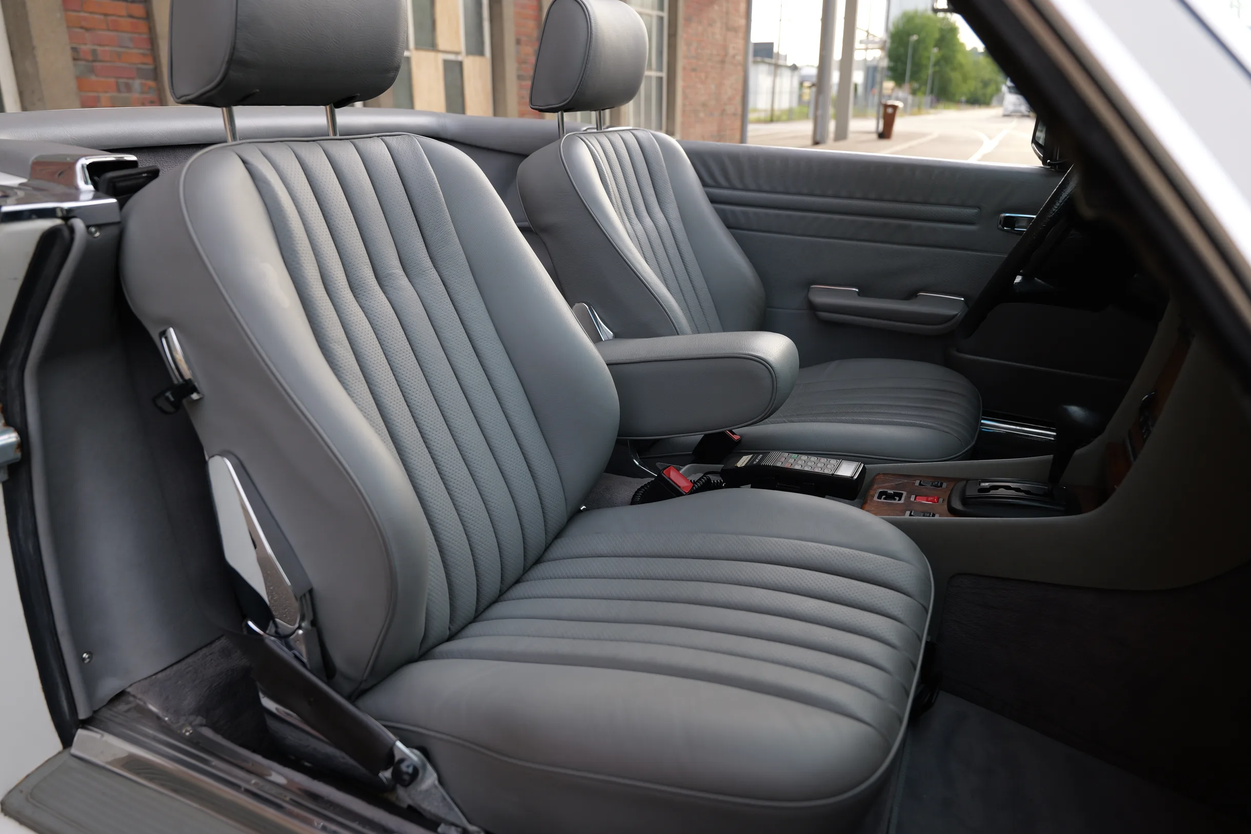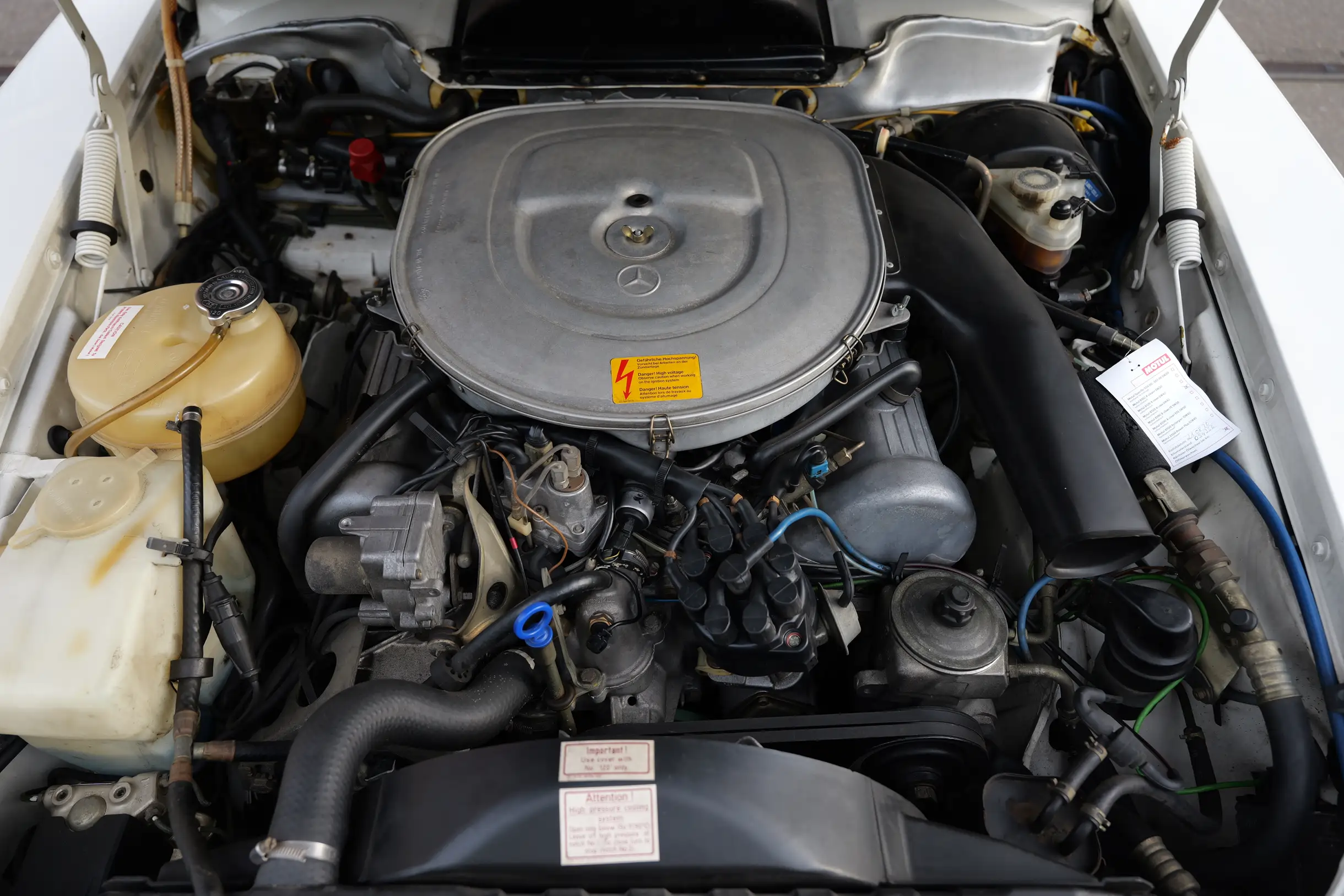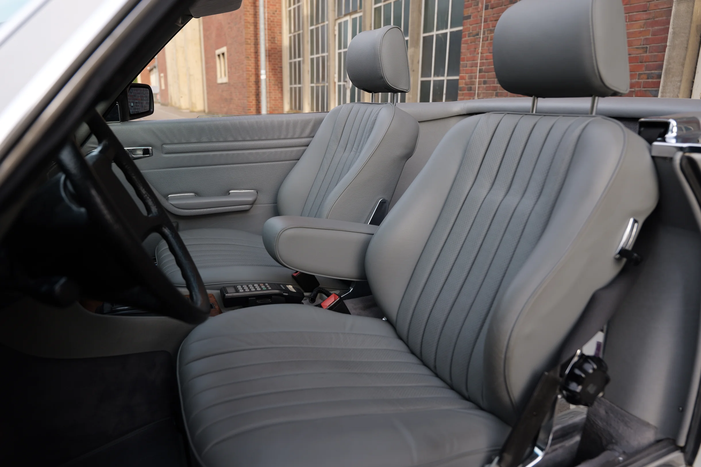 Der hier angebotene Mercedes-Benz 380SL befindet sich weitestgehend im Erstlack und versprüht mit seiner Lackierung in Classicweiß Uni (737U) und den seltenen AMG Penta 16 Zoll Alufelgen einen sportlichen Charme. Die harmonisch passende Innenausstattung in Leder Grau (278A) und das elegante Wurzelholz befinden sich in einem sehr schönen Zustand. Das Verdeck in Stoff Schwarz sowie das dazugehörige Hardtop sind ebenfalls überdurchschnittlich gut erhalten. Der M116 V8-Motor mit 3.839 cm³ Hubraum, 155 PS Leistung und 310 Nm Drehmoment bietet im Verbindung mit dem Viergang-Automatikgetriebe guten Vortrieb und viel Fahrspaß. Die Erstzulassung im sonnigen Kalifornien erfolgte im Juli 1985. Die Carfax Historie von 1992 bis zum Reimport des Roadsters im Jahr 2019 liegt vor. In Deutschland wurden der SL auf die europäischen Scheinwerfer und Stoßstangen umgebaut. Das Kombi-Instrument blieb original und weist eine aktuelle Laufleistung von knapp 55.600 Meilen auf. Ein Fahrzeuggutachten von classic-analytics aus dem Jahr 2022 bestätigt den mängelfreien und gut erhaltenen Zustand des Fahrzeugs. Der neue Besitzer darf sich auf einen sehr gepflegte SL-Roadster freuen, der mit seinem sportlichen Charakter einen ganz eigenen Charme versprüht und eine Menge Fahrfreude vermittelt.